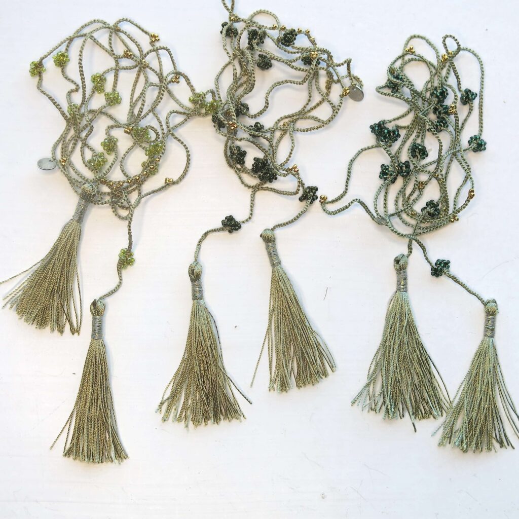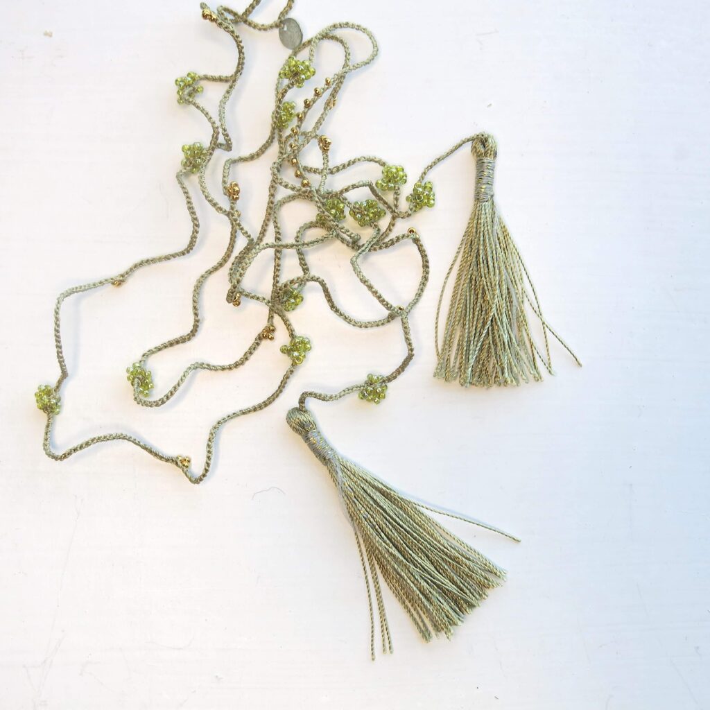 Handgehäkelte Kette und Wickel Armband in Grüntönen
