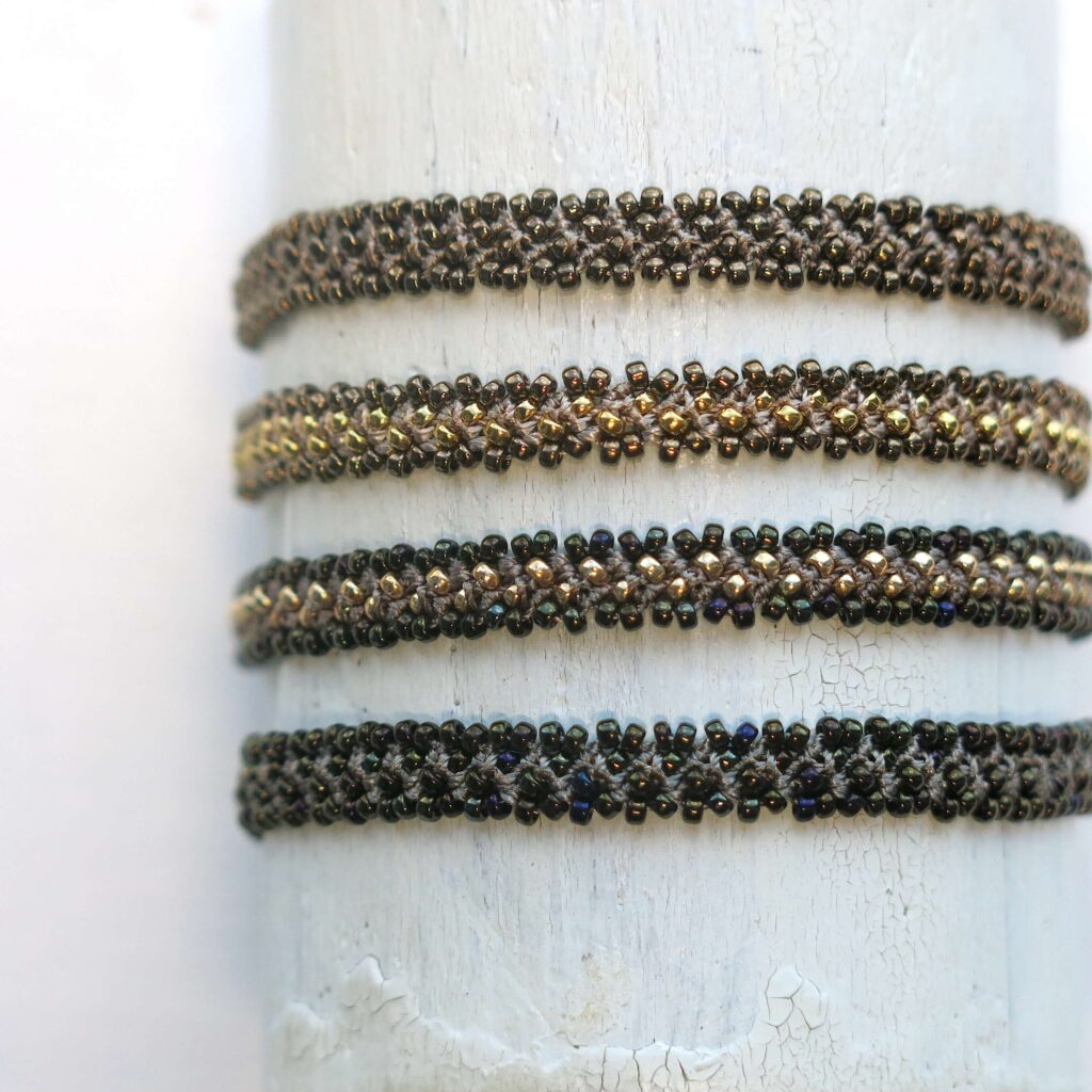 Häkel-Armband ‚peyote‘: Metallic schimmernde Glasperlen