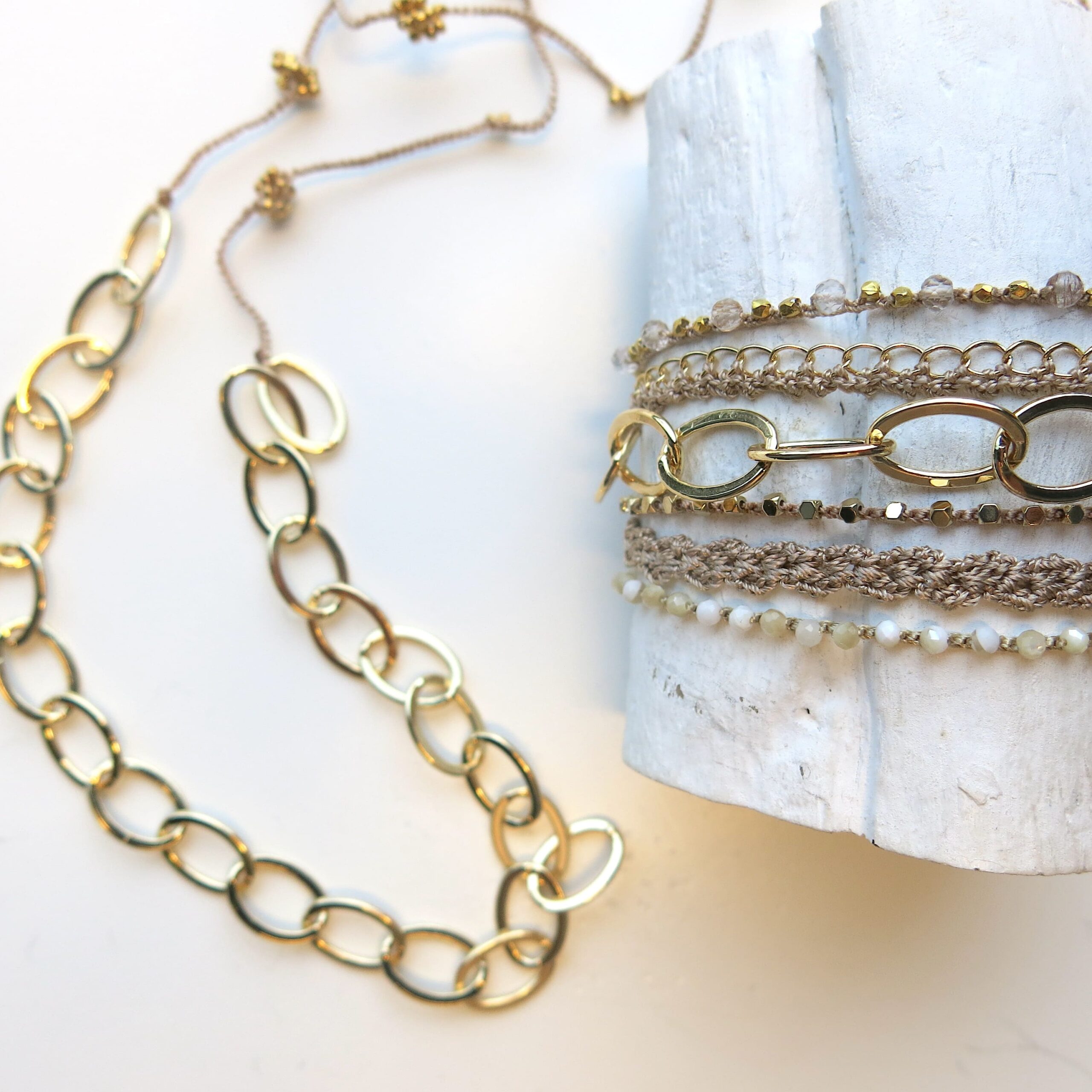 Die Accessoires wirken auf den ersten Blick eher ’schlicht‘ – beim näheren Hinschauen erkennt man die filigrane und aufwendige Handarbeit. Trotzdem soll ‚der Look‘ eher schlicht und dezent sein. Ein Accessoire, welches man täglich tragen kann und was sich leicht kombinieren lässt. Die Armbänder aus der Kollektion lassen sich untereinander wundervoll zusammen stellen, aber auch in Kombination mit anderem Schmuck harmonisieren sie sehr schön.