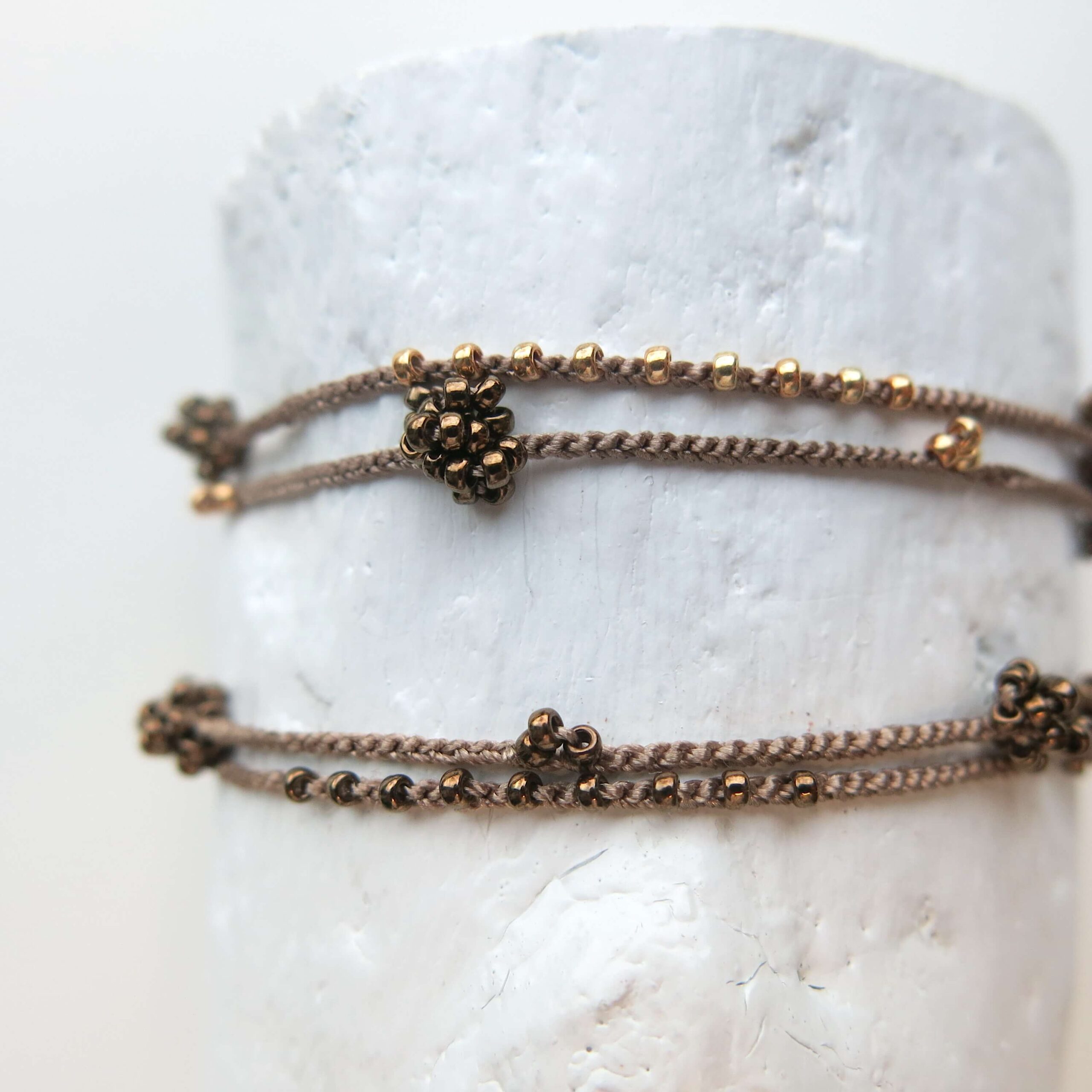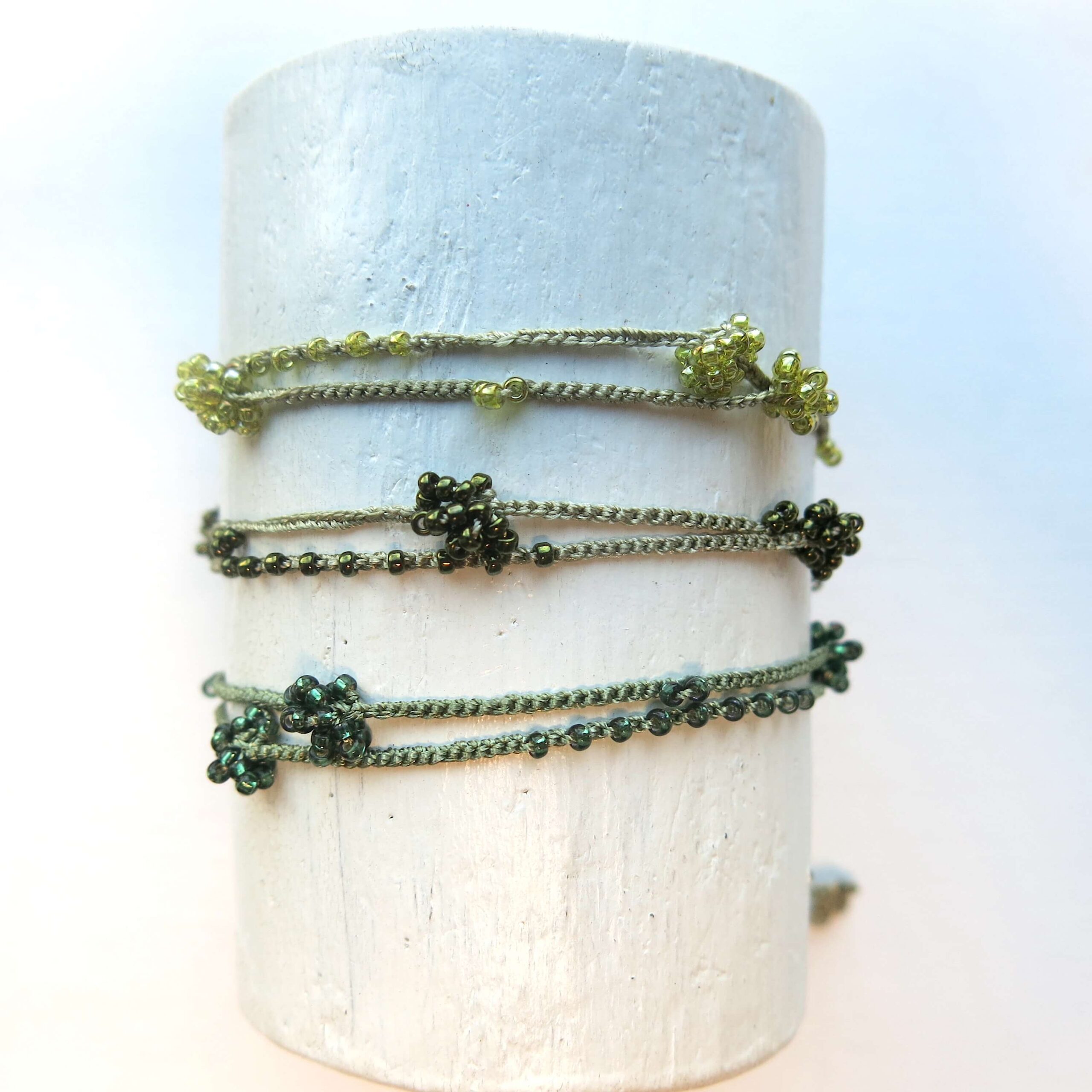 Modell HOLLY 2 wird doppelt um das Handgelenk getragen. Von der Technik bzw. Optik ist es wie Kette BEA, nur mit Verschlussperle als Armband gearbeitet. Es gibt acht wunderschöne Farben: Silber, Rosesilber, Gold, Bronze, Caviar, Olive, Grün und Farngrün.