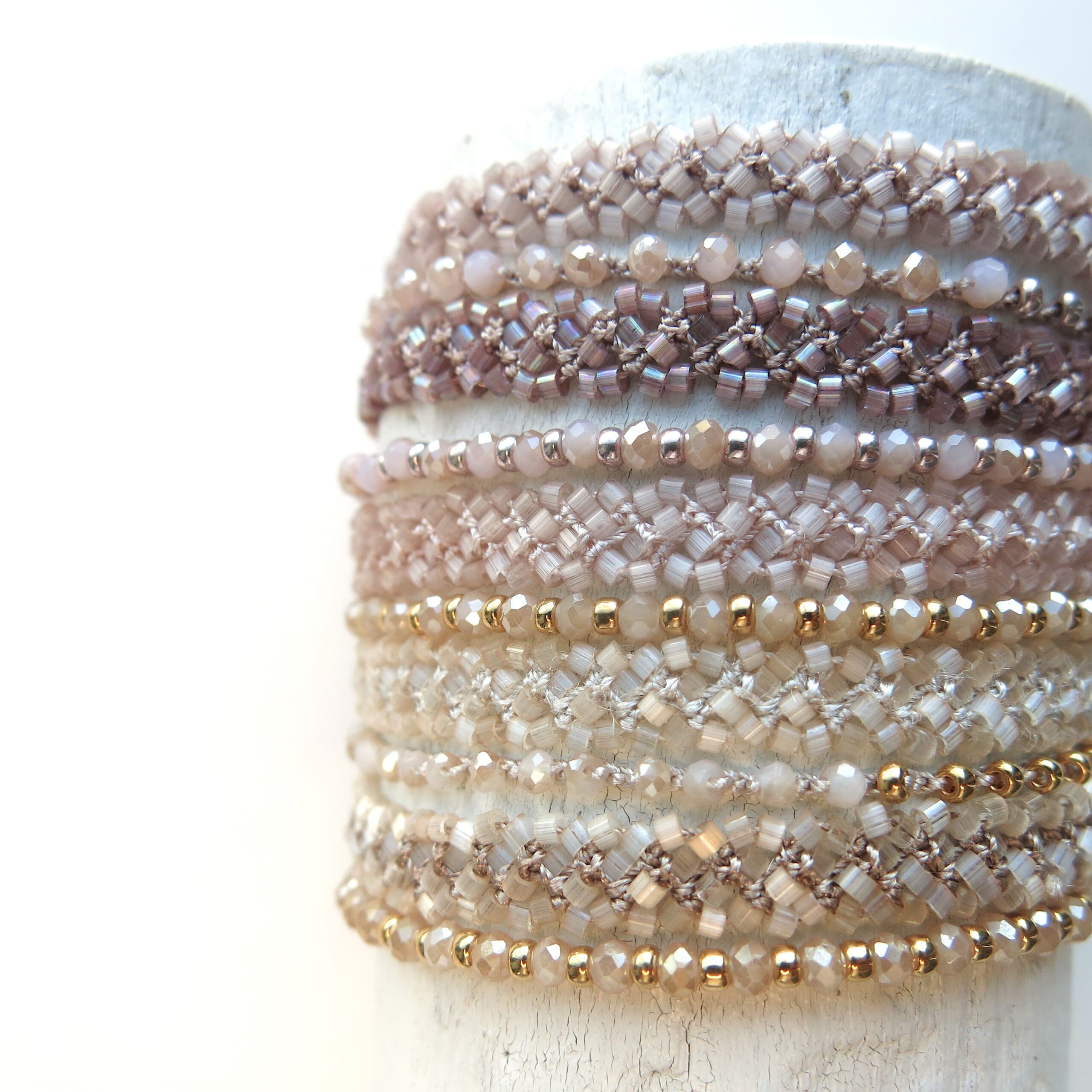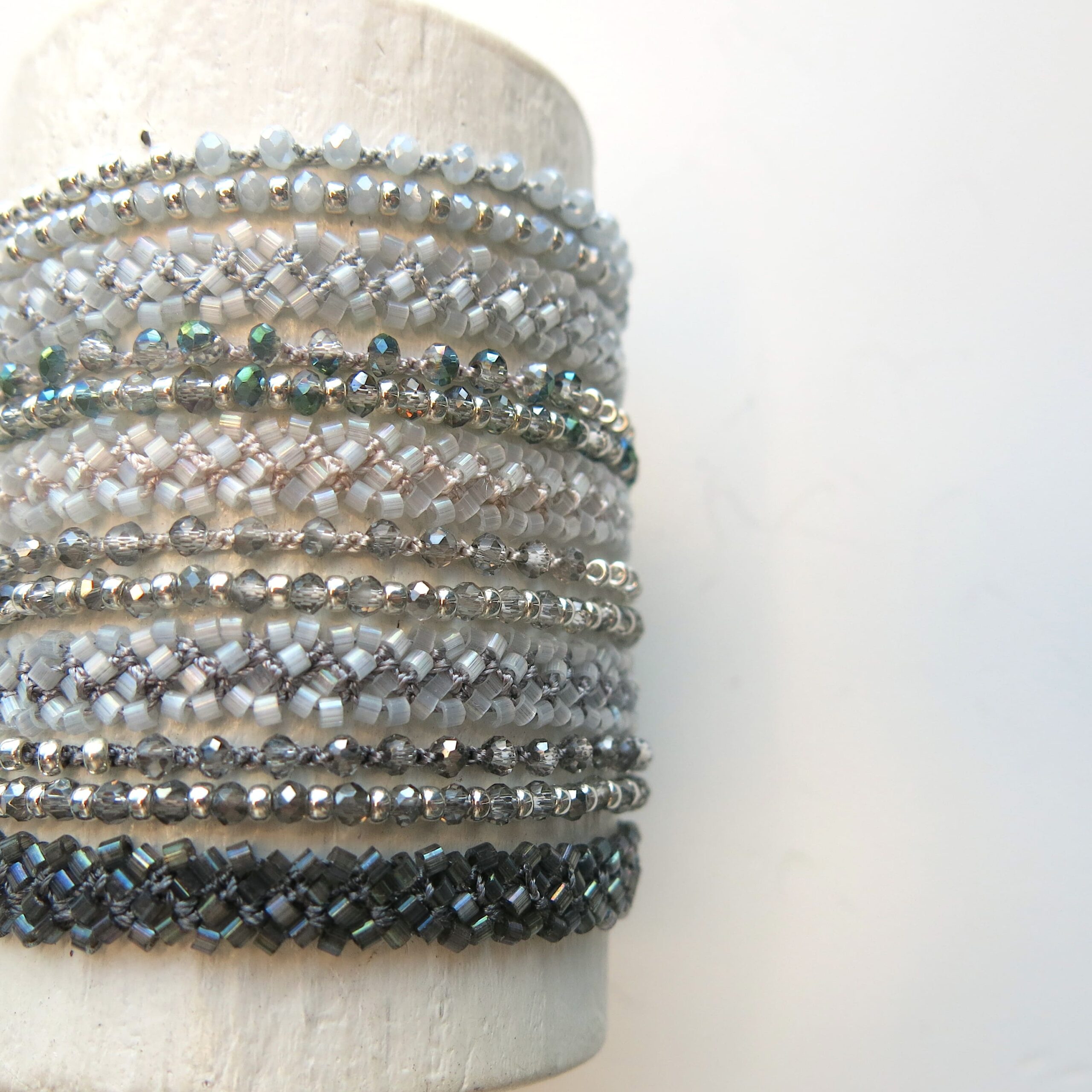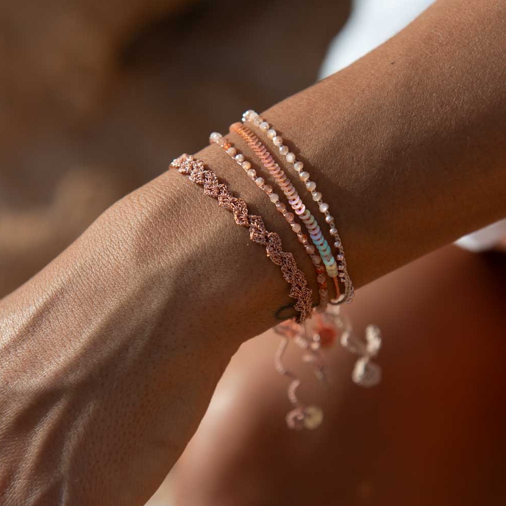 Die Armbänder haben als Art Verschluss eine verschiebbare Perle, die sich auf Ihre individuelle Größe regulieren lässt.