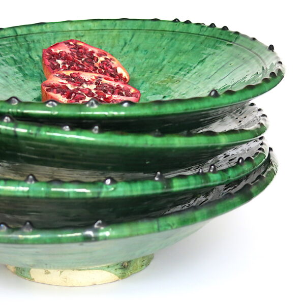 Diese einzigartige grüne Keramik kommt aus dem Süden Marokkos – Tamegroute: besonders an dieser Tonware ist ihre grüne Farbe bzw. Glasur. Die Glasur besteht aus verschiedenen im Boden der Region vorkommenden Mineralien – unter anderem Kupferoxid. Erst beim Brennvorgang bei über 900 Grad entsteht der wunderschöne Grünton in zahlreichen Varianten. Von der Form her sind diese Art Schalen sehr schön ‚offen und flach‘ gearbeitet. Jedes Stück ist ein Unikat.