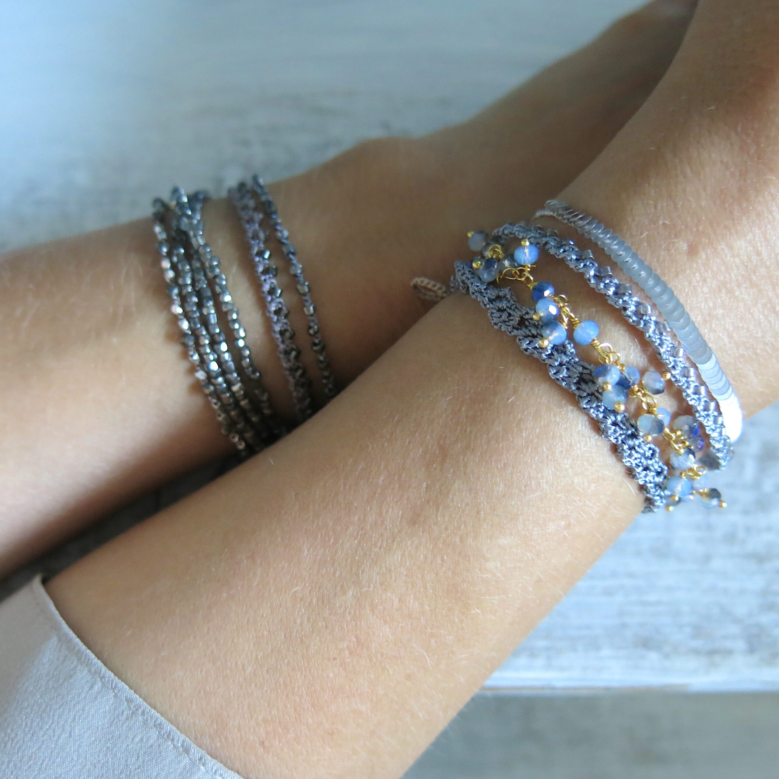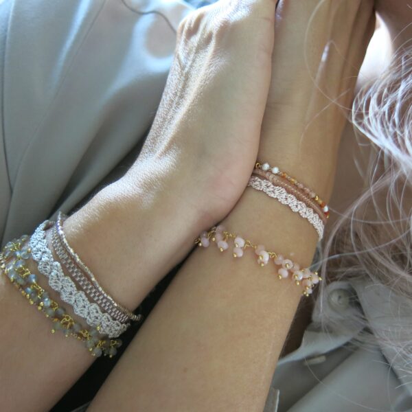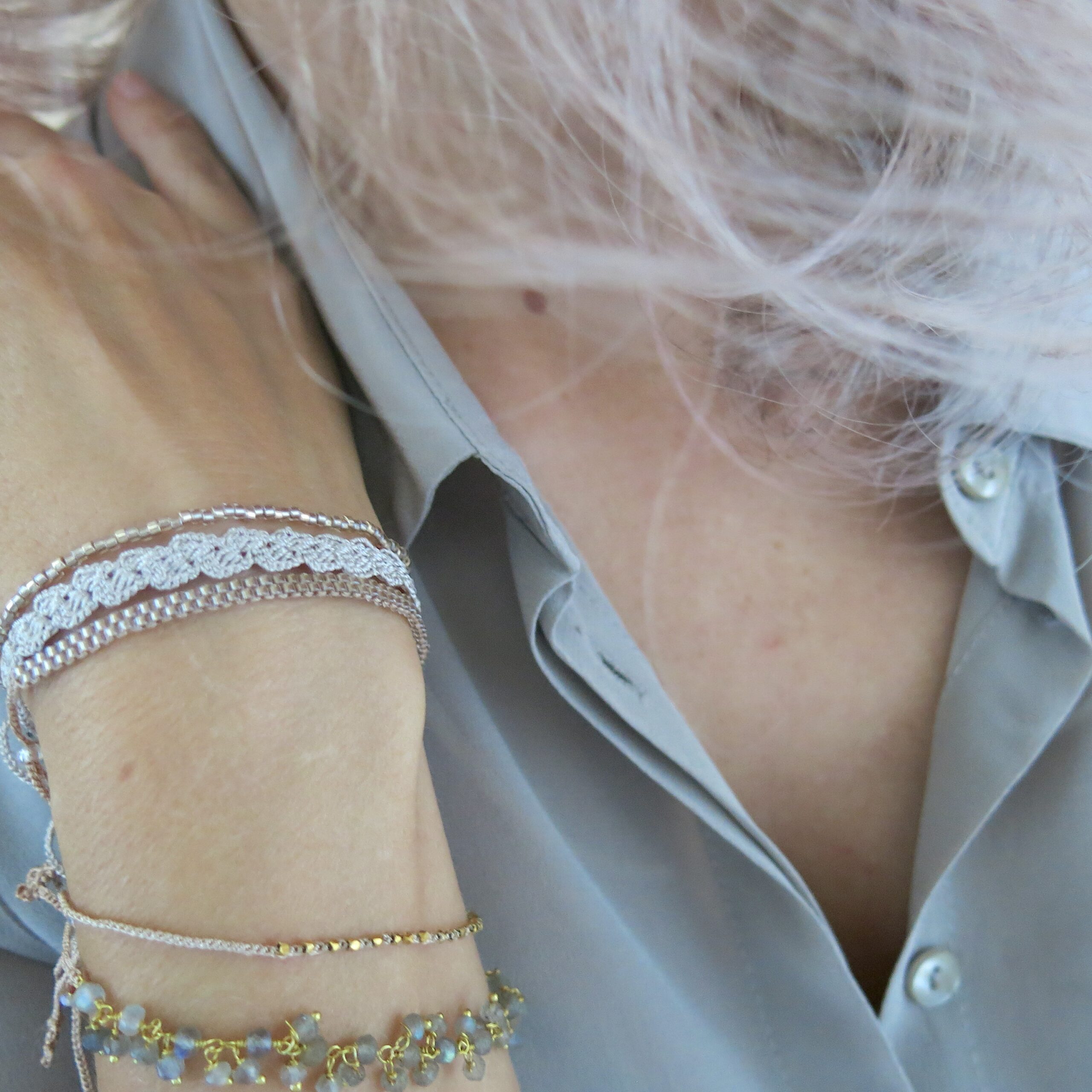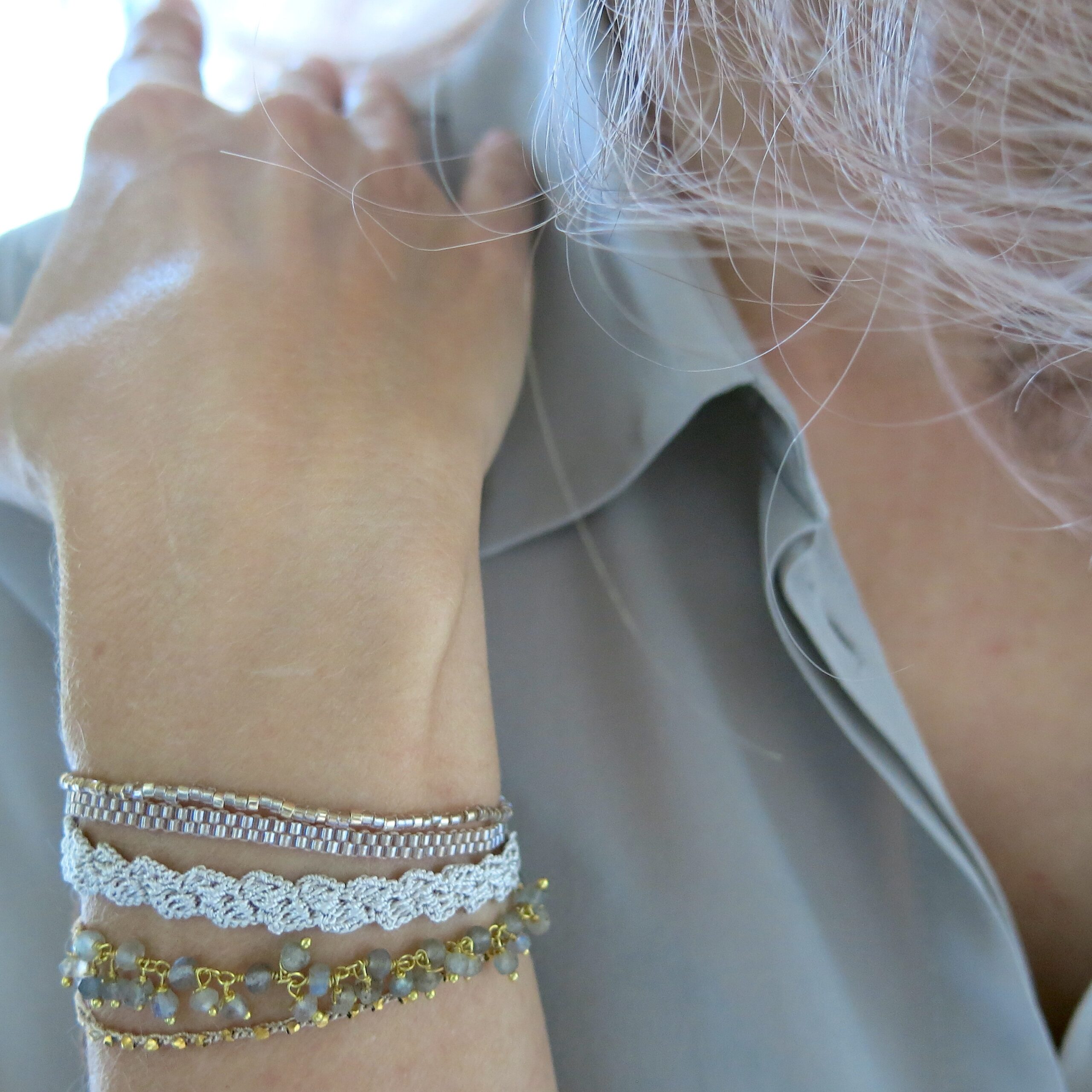 Die Accessoires wirken auf den ersten Blick eher ’schlicht‘ – beim näheren Hinschauen erkennt man die filigrane und aufwendige Handarbeit. Trotzdem soll ‚der Look‘ eher schlicht und dezent sein. Ein Accessoire, welches man täglich tragen kann und was sich leicht kombinieren lässt. Die Armbänder aus der Kollektion lassen sich untereinander wundervoll zusammen stellen, aber auch in Kombination mit anderem Schmuck harmonisieren sie sehr schön.
