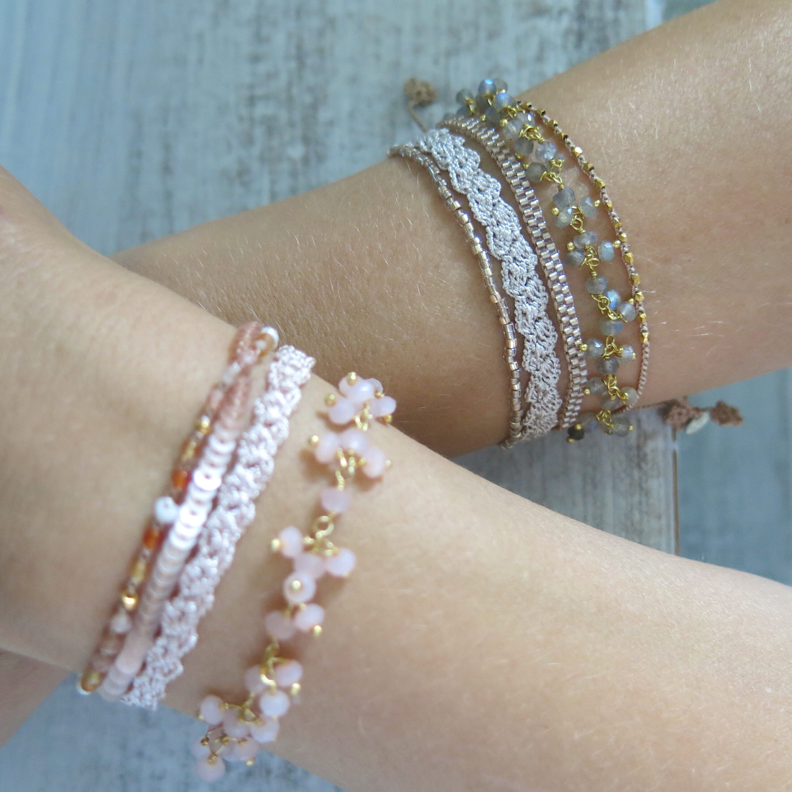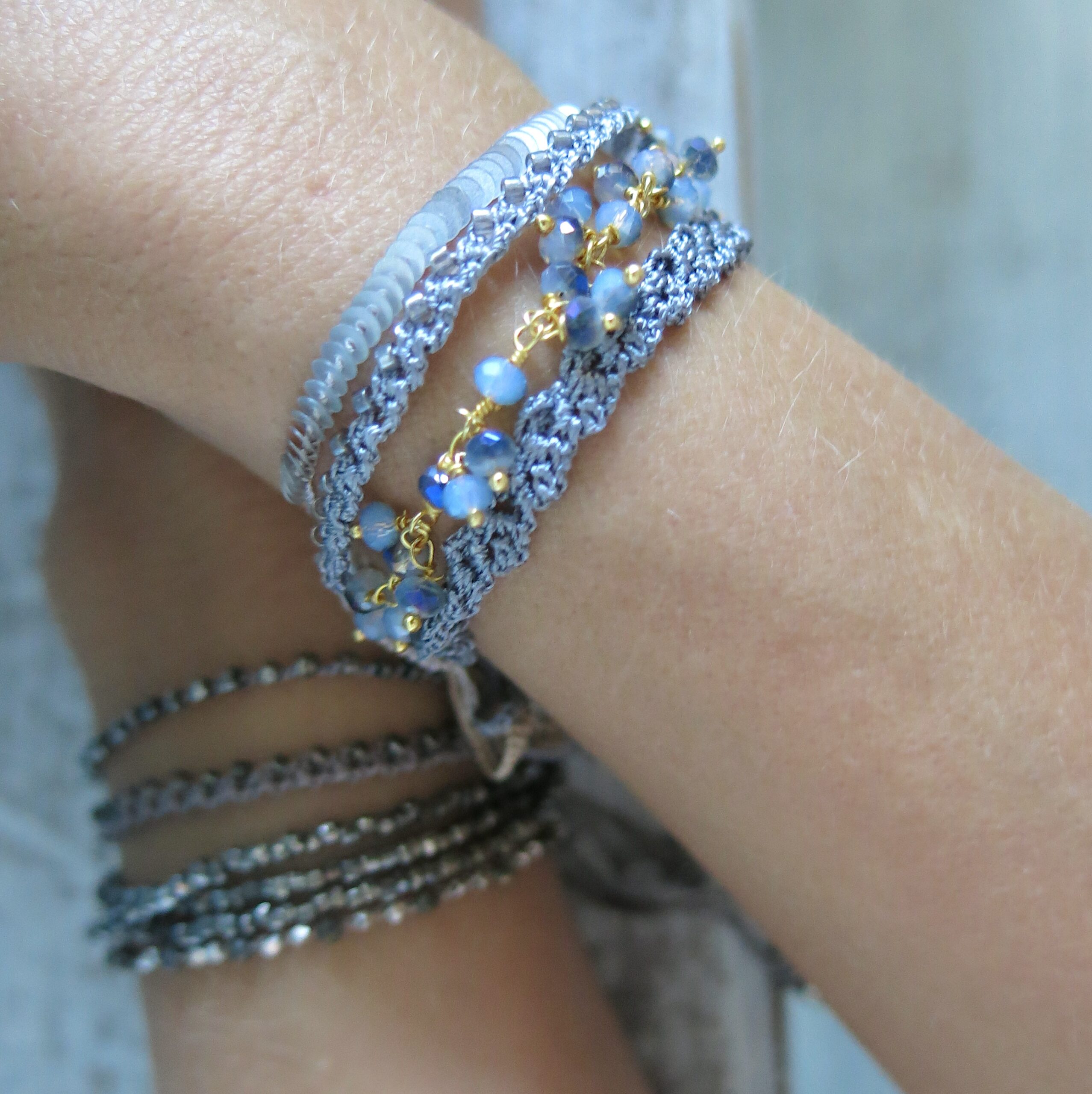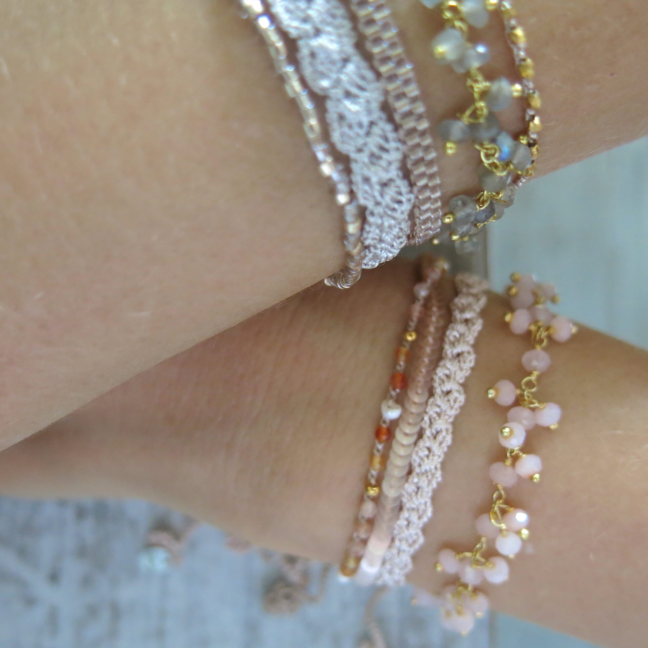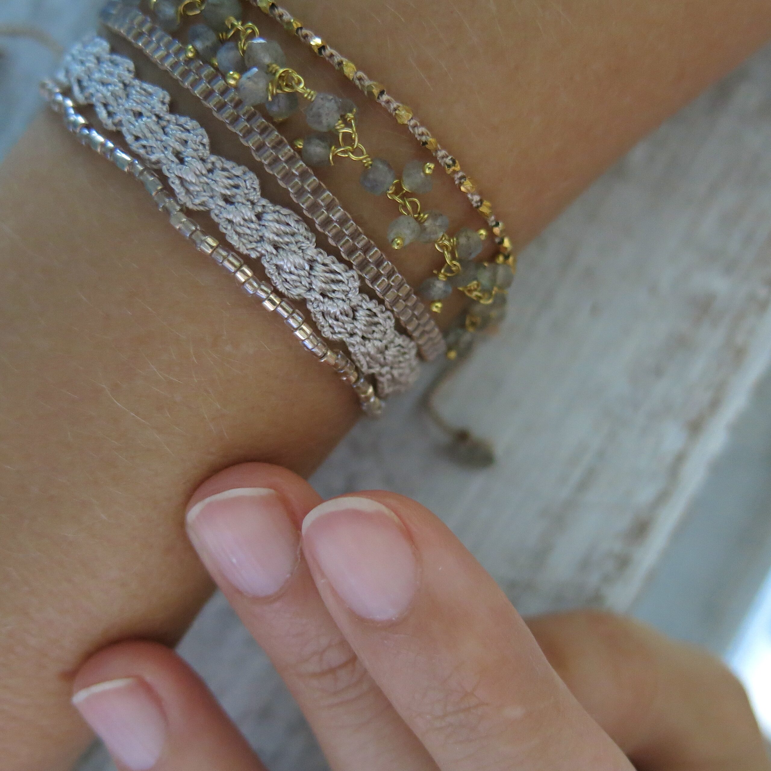 Die Accessoires wirken auf den ersten Blick eher ’schlicht‘ – beim näheren Hinschauen erkennt man die filigrane und aufwendige Handarbeit. Trotzdem soll ‚der Look‘ eher schlicht und dezent sein. Ein Accessoire, welches man täglich tragen kann und was sich leicht kombinieren lässt. Die Armbänder aus der Kollektion lassen sich untereinander wundervoll zusammen stellen, aber auch in Kombination mit anderem Schmuck harmonisieren sie sehr schön.