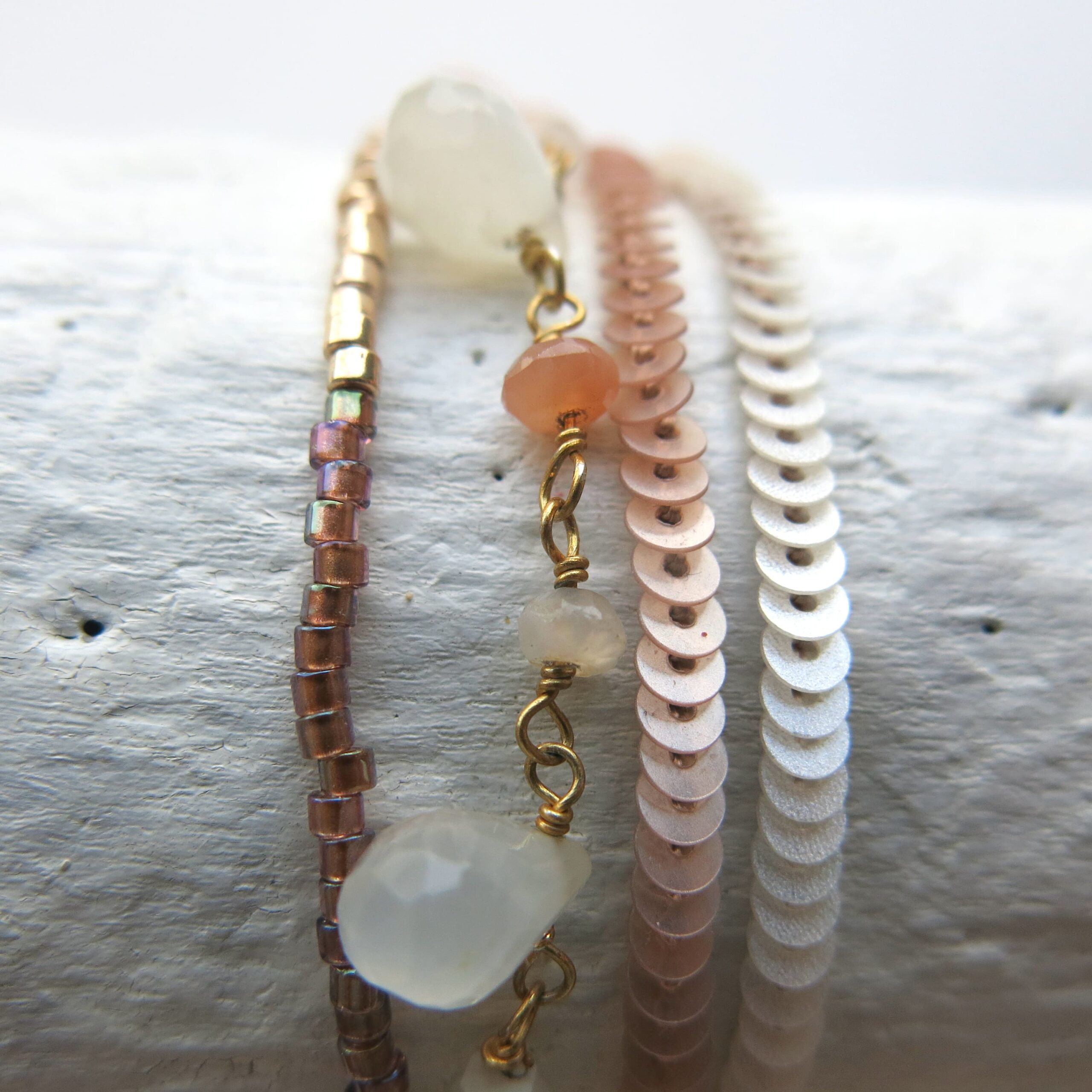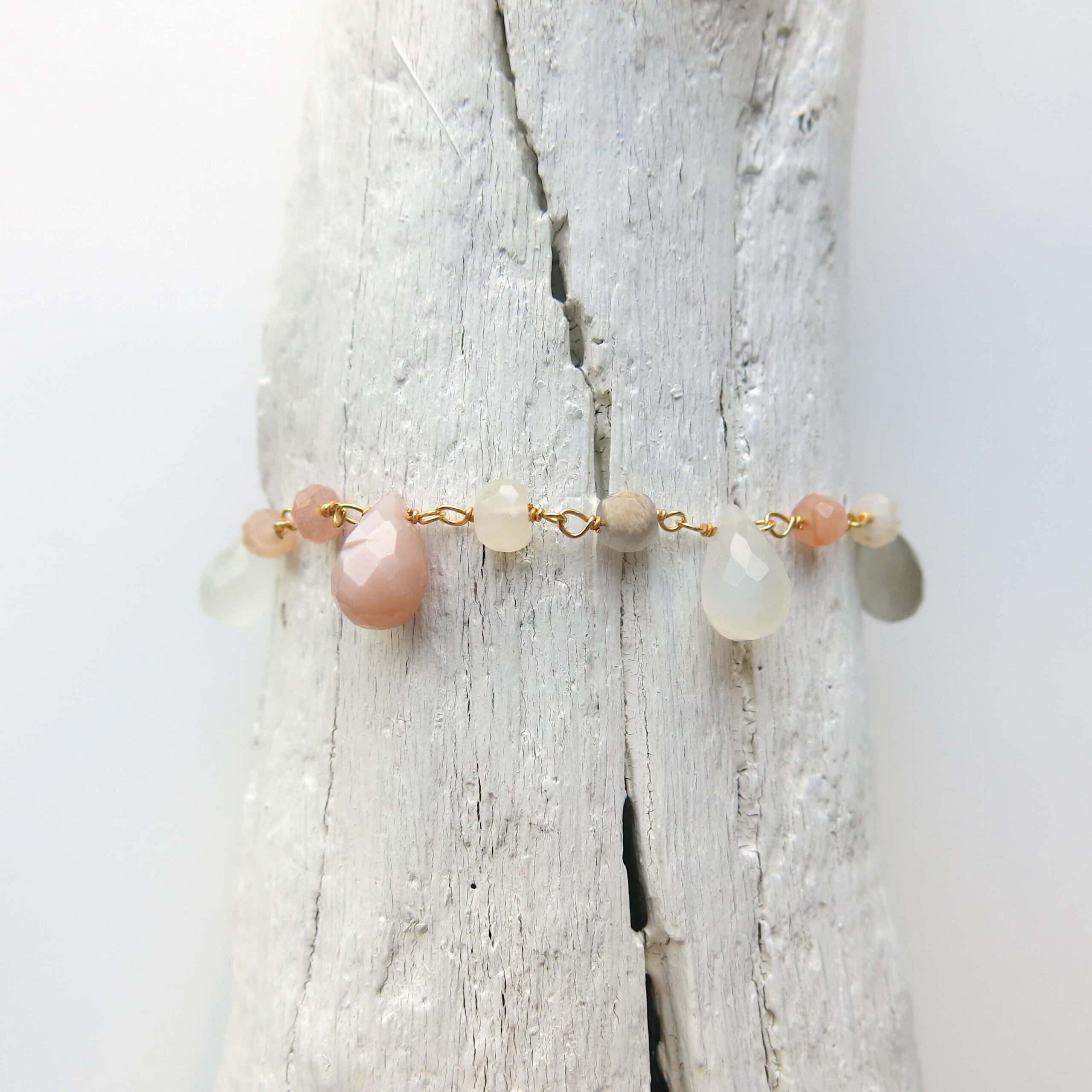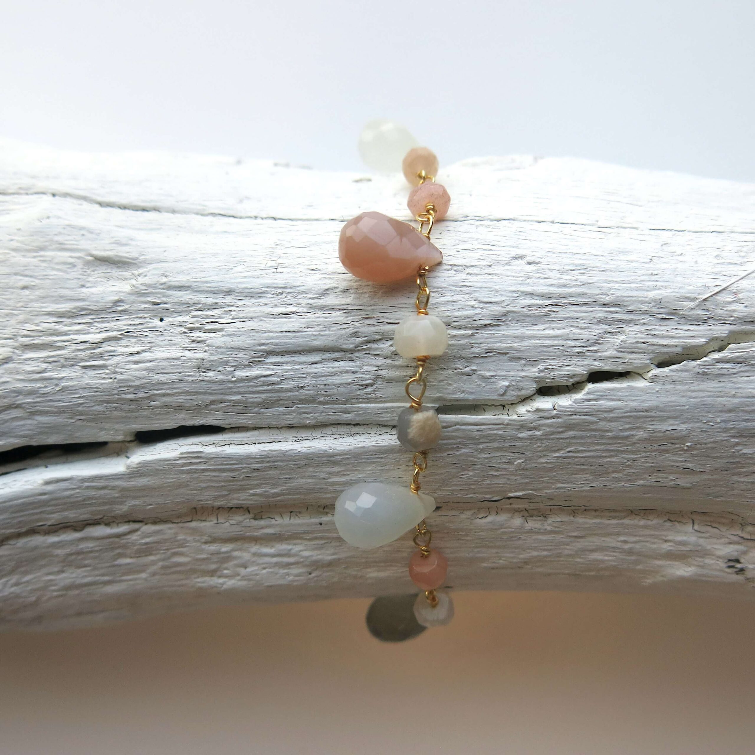 Armband NESSY Lux ist ein Armband mit natürlichem Mondstein Edelsteinkettchen. Die Edelsteine haben unterschiedliche Formen – Tropfen&Rondelle und variieren in der Farbgebung immer etwas.