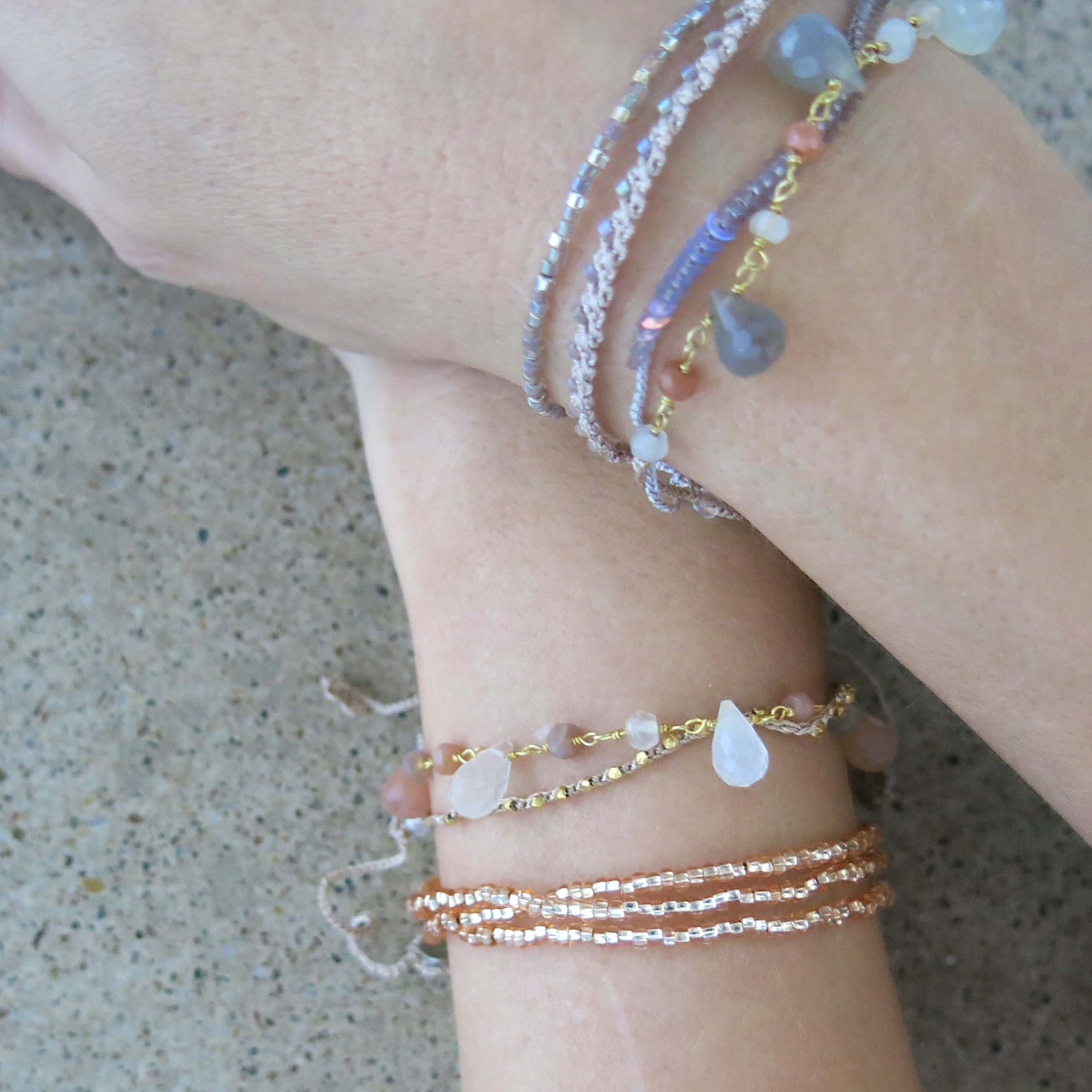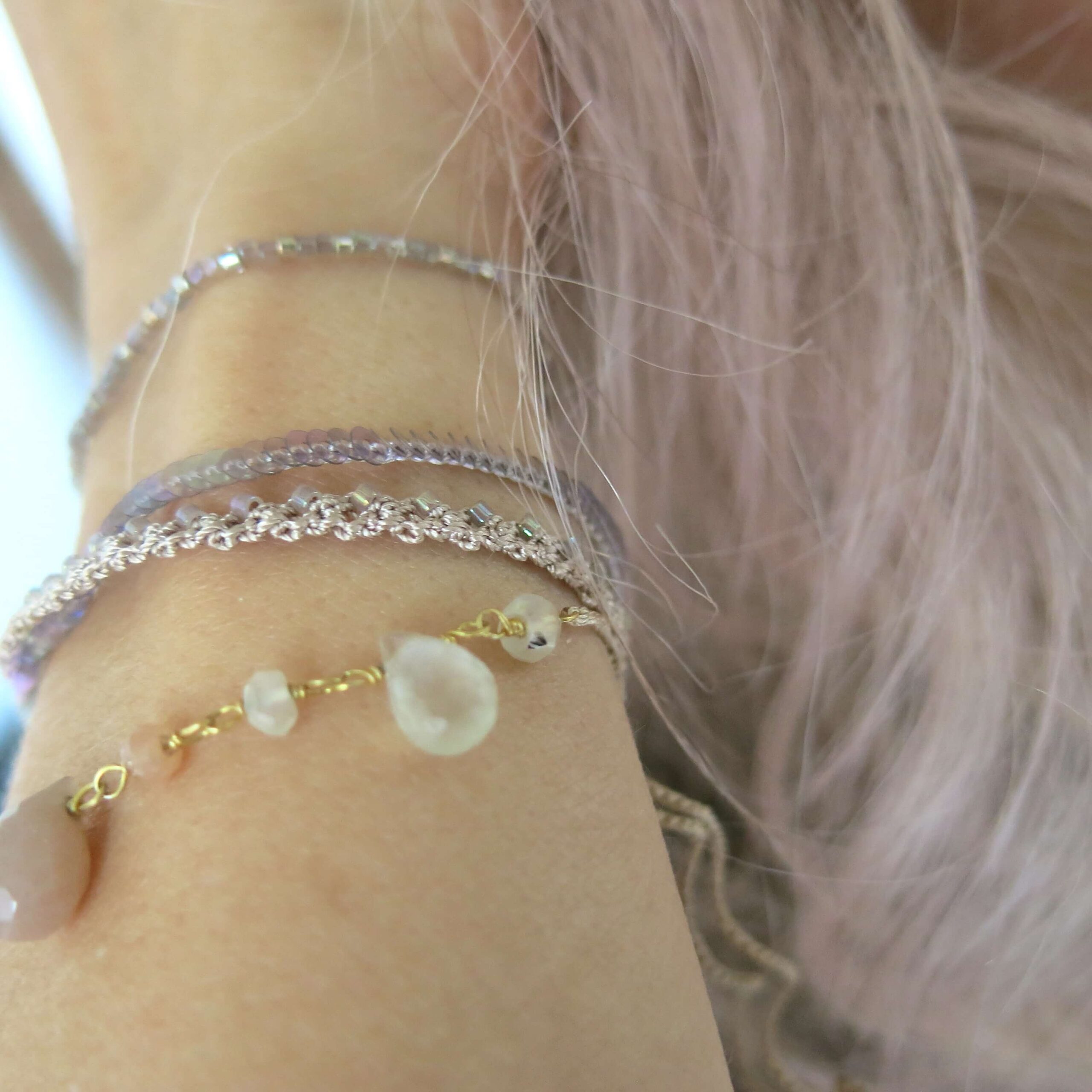 Die Armbänder haben als Art Verschluss eine verschiebbare Perle, die sich auf Ihre individuelle Größe regulieren lässt.