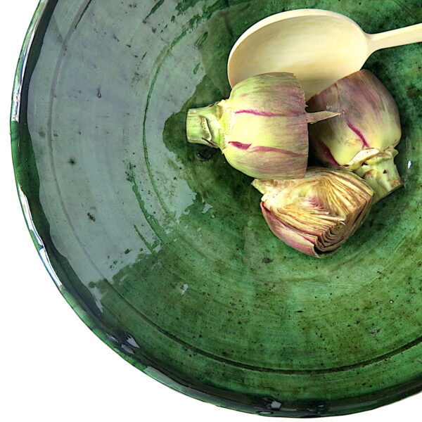 Diese einzigartige grüne Keramik kommt aus dem Süden Marokkos – Tamegroute: besonders an dieser Tonware ist ihre grüne Farbe bzw. Glasur. Die Glasur besteht aus verschiedenen im Boden der Region vorkommenden Mineralien – unter anderem Kupferoxid. Erst beim Brennvorgang bei über 900 Grad entsteht der wunderschöne Grünton in zahlreichen Varianten. Dieser Grünton ist etwas heller als der ‚übliche‘, der mehr in die ‚Flaschengrün-Oliv-Richtung‘ geht. Ich finde diesen Farbton besonders schön, da er der eher rustikalen, schweren Keramik eine gewisse Leichtigkeit und Modernität verleiht. Jede Schale ist ein Einzelstück und unterscheidet sich immer ein wenig durch Form und Farbe der Glasur.