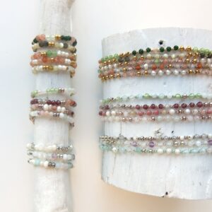 Modell ‚JETTE‘ ist ein feines gehäkeltes Armband im Edelstein Mix. Es gibt sieben verschiedene Mix-Varianten diverser natürlicher Edelsteine in Kombination mit einer plated 2mm Miyuki Metallperle – 24 KT Gold Plated.