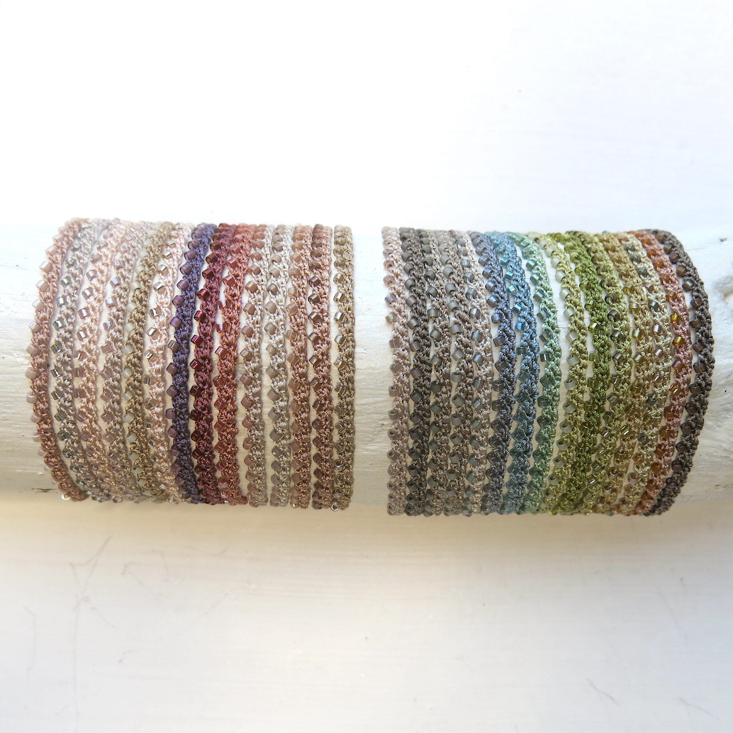 Modell ‚ELINA‘ ist ein feines handgehäkeltes Armband mit einseitigem Perlenbesatz. Die ‚MIYUKI Delica Perlen‘ in herbstlichen Pastelltönen haben einen wunderschönen soften Schimmer oder sind ‚leicht irisierend‘. Das verleiht dem eher schlichten Armband einen dezenten ‚Glam Look‘. Sehr schön in Kombination mit anderen Armbändern.