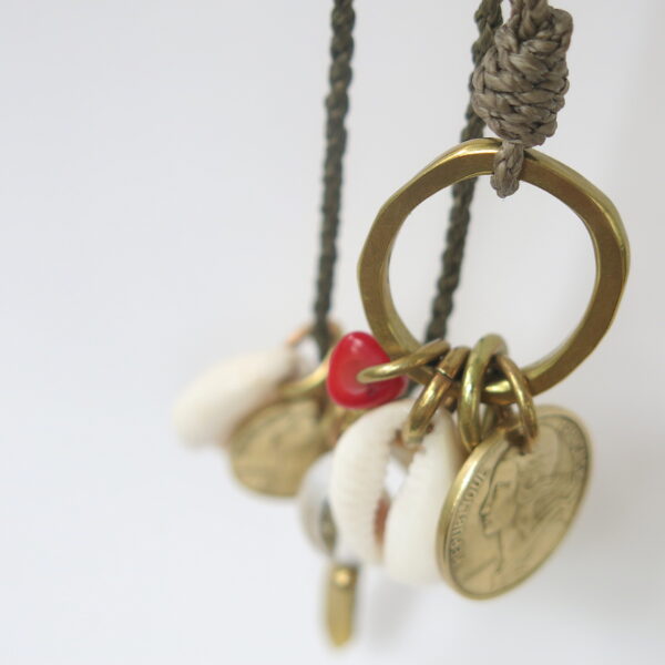 Die Ketten ‚lucky charm‘ habe ich auf Ibiza entdeckt: Viviana fertigt diese Ketten in liebevoller Handarbeit und mit viel Kreativität. Sie kombiniert alte Münzen mit Kauri Muscheln (Porzellan Muschel) und selbstgefertigten Anhängern aus Messing wie verschiedene Ringe, eine Art ‚Metallschleife‘ und verschiedene Metallstifte. Hinzu kommen – als kleiner ‚dot of color‘ – verschiedenste ausgewählte Edelsteine ‚gemstones‘.