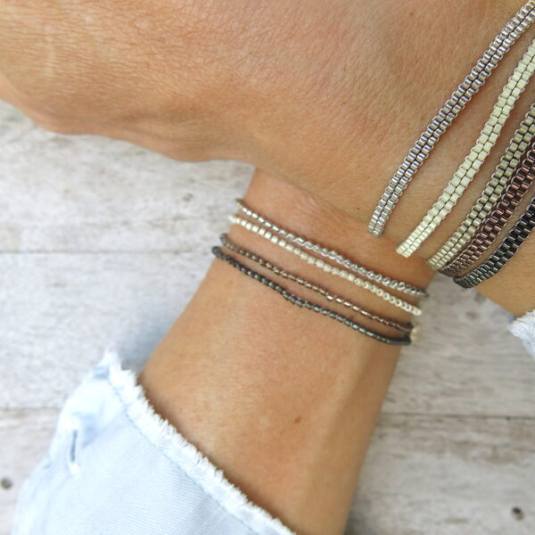 Die 1,6mm MIYUKI Delica Perlen haben einen metallischem Schimmer (kupfer, schwarz) und sind galvanisiert (pewter, weißsilber). Die Armbänder im ‚metallic look‘ setzen einen besonderen Akzent und lassen sich zu allem gut kombinieren.