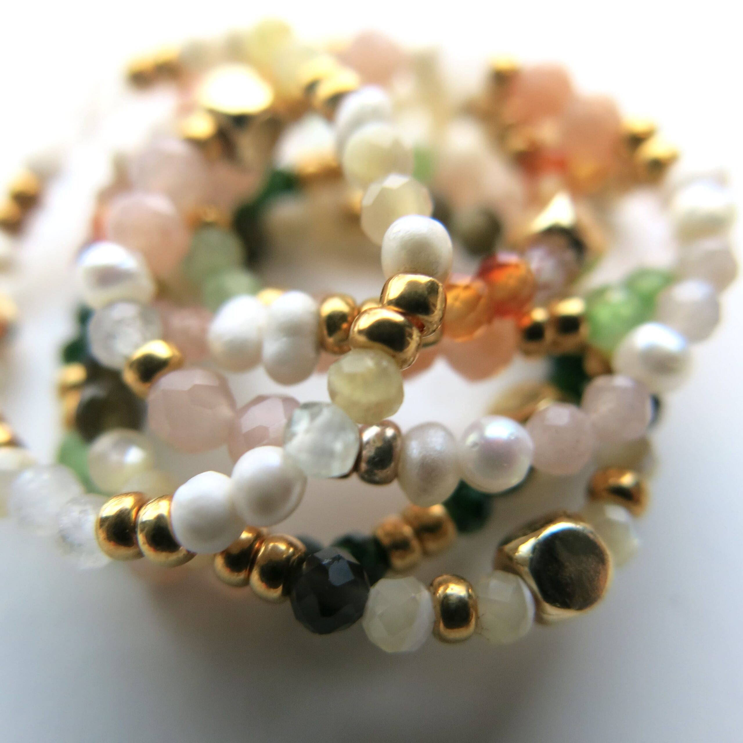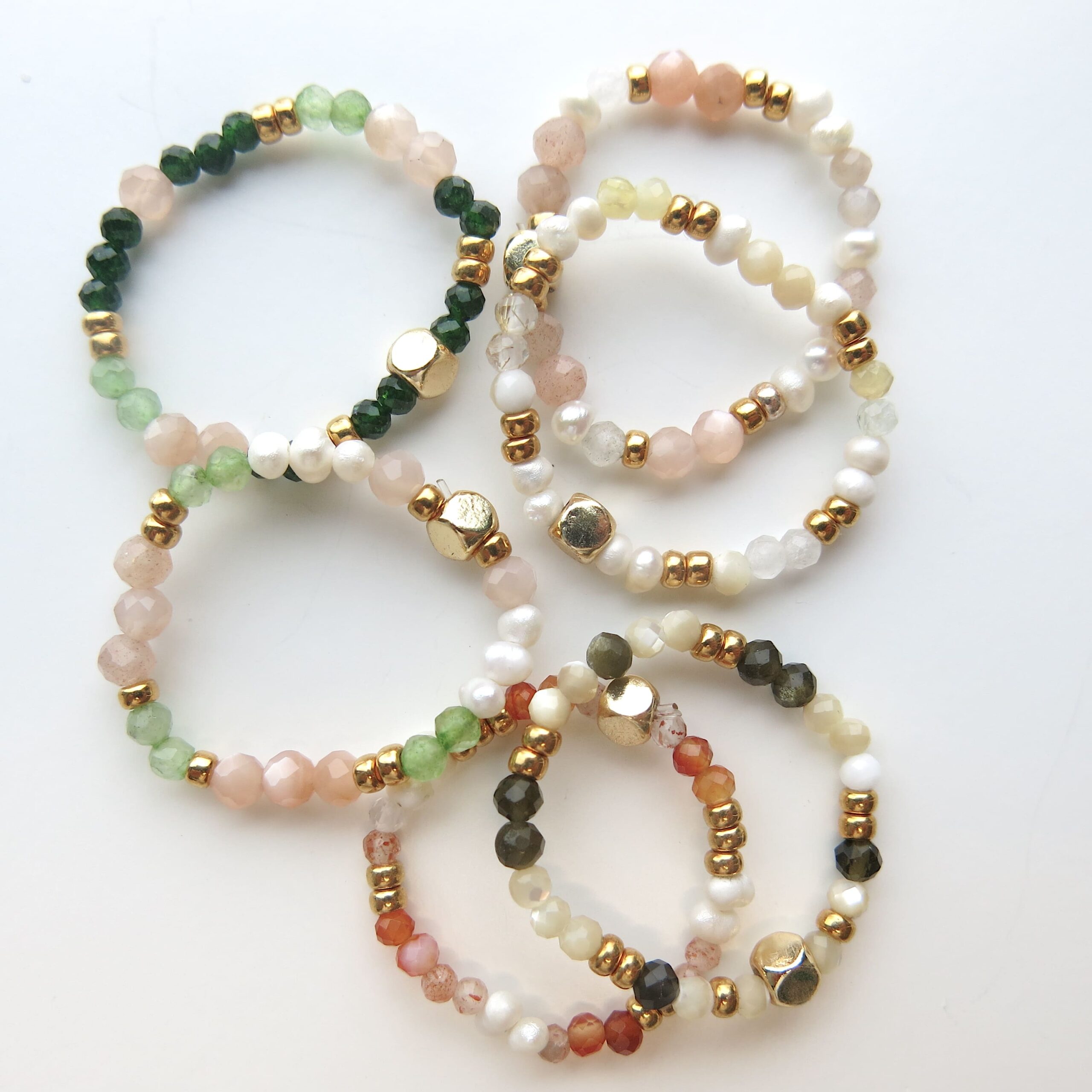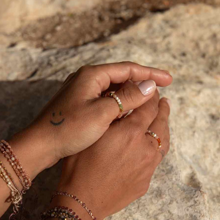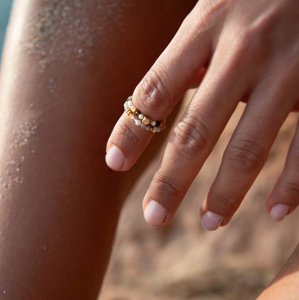 Modell ‚ROSA‘ ist ein feiner Ring im Edelstein Mix. Es gibt sechs verschiedene Mix-Varianten diverser natürlicher Edelsteine in Kombination mit einer plated 2mm 24KT Gold Miyuki Metallperle.