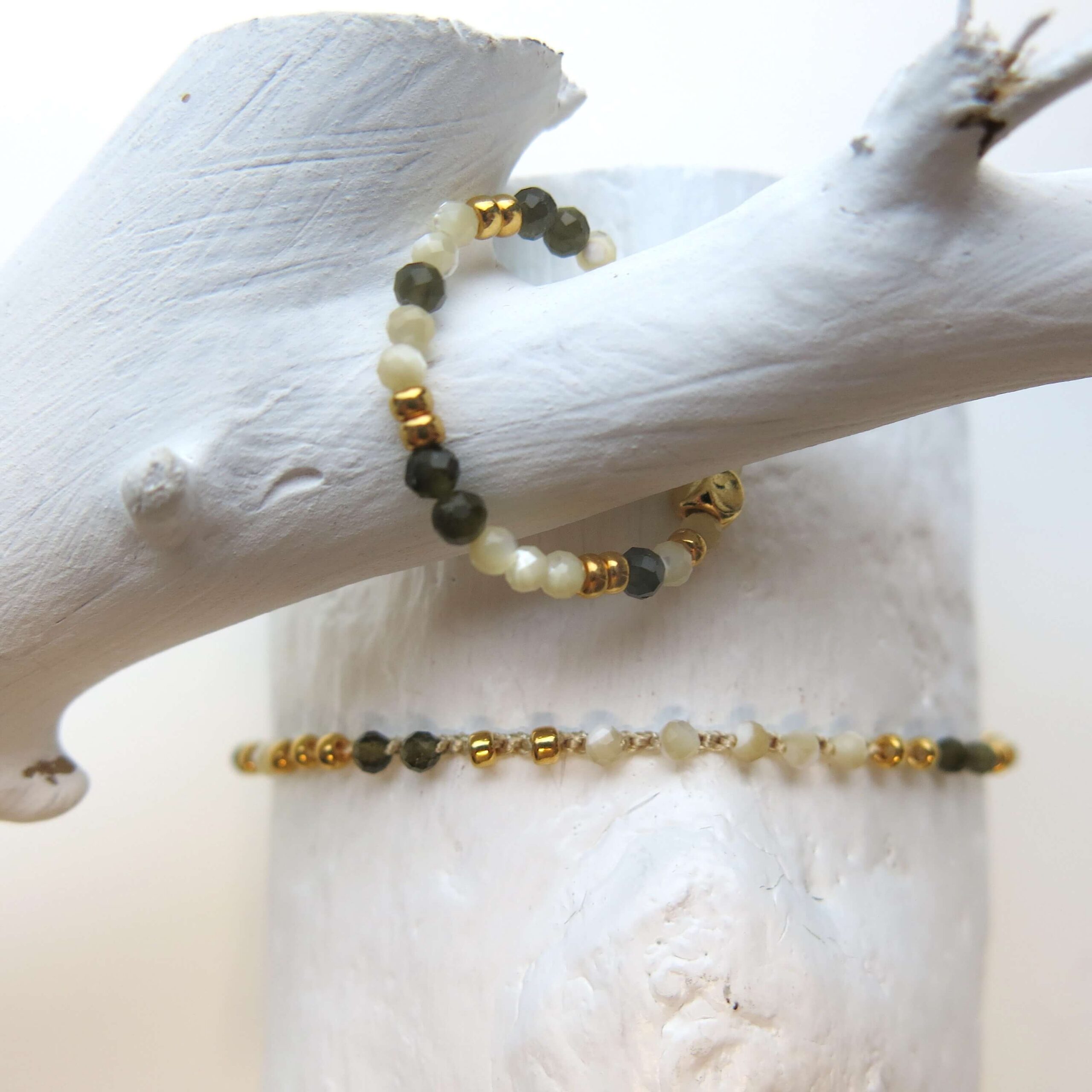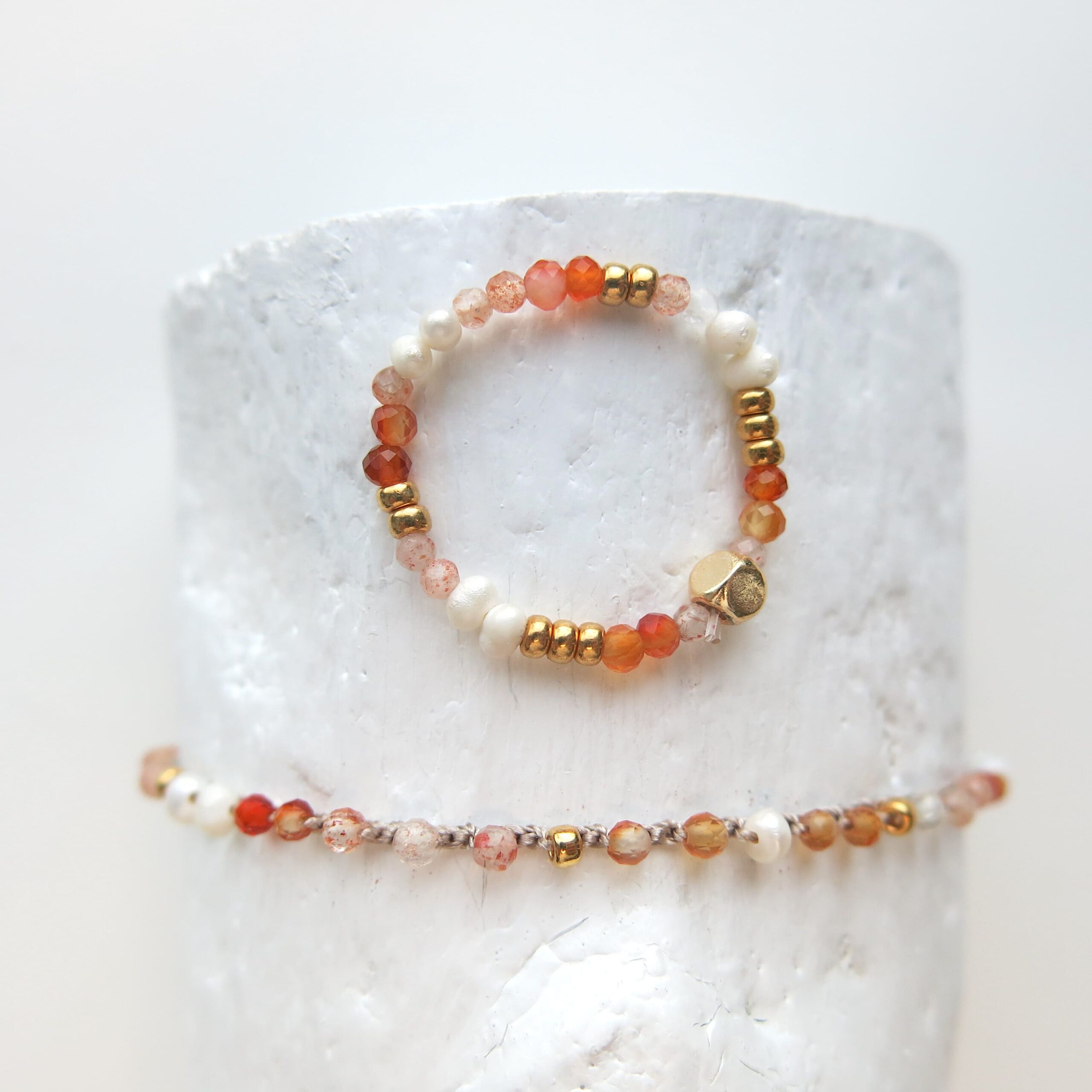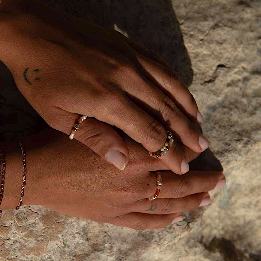 Modell ‚ROSA‘ ist ein feiner Ring im Edelstein Mix. Es gibt sechs verschiedene Mix-Varianten diverser natürlicher Edelsteine in Kombination mit einer plated 2mm 24KT Gold Miyuki Metallperle.
