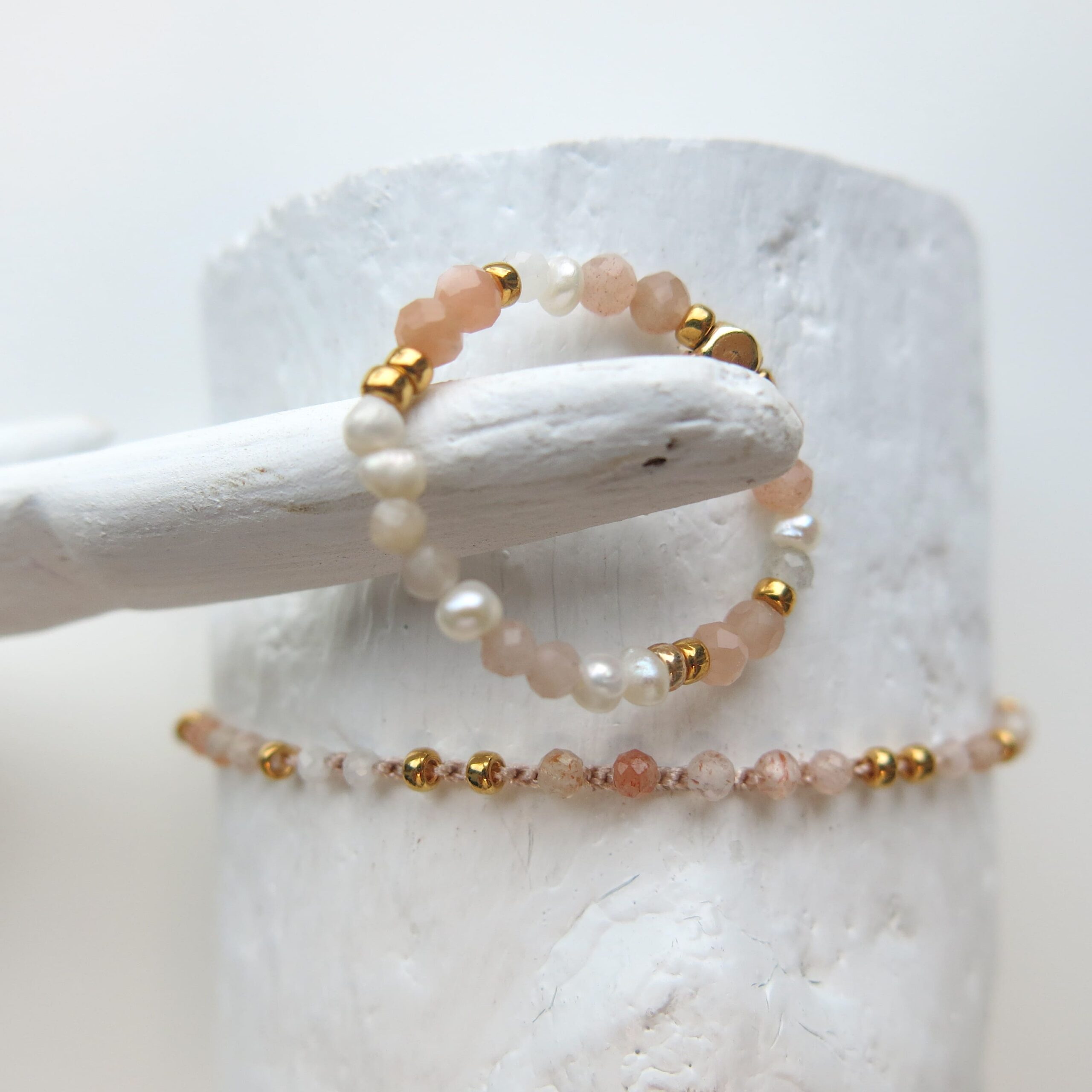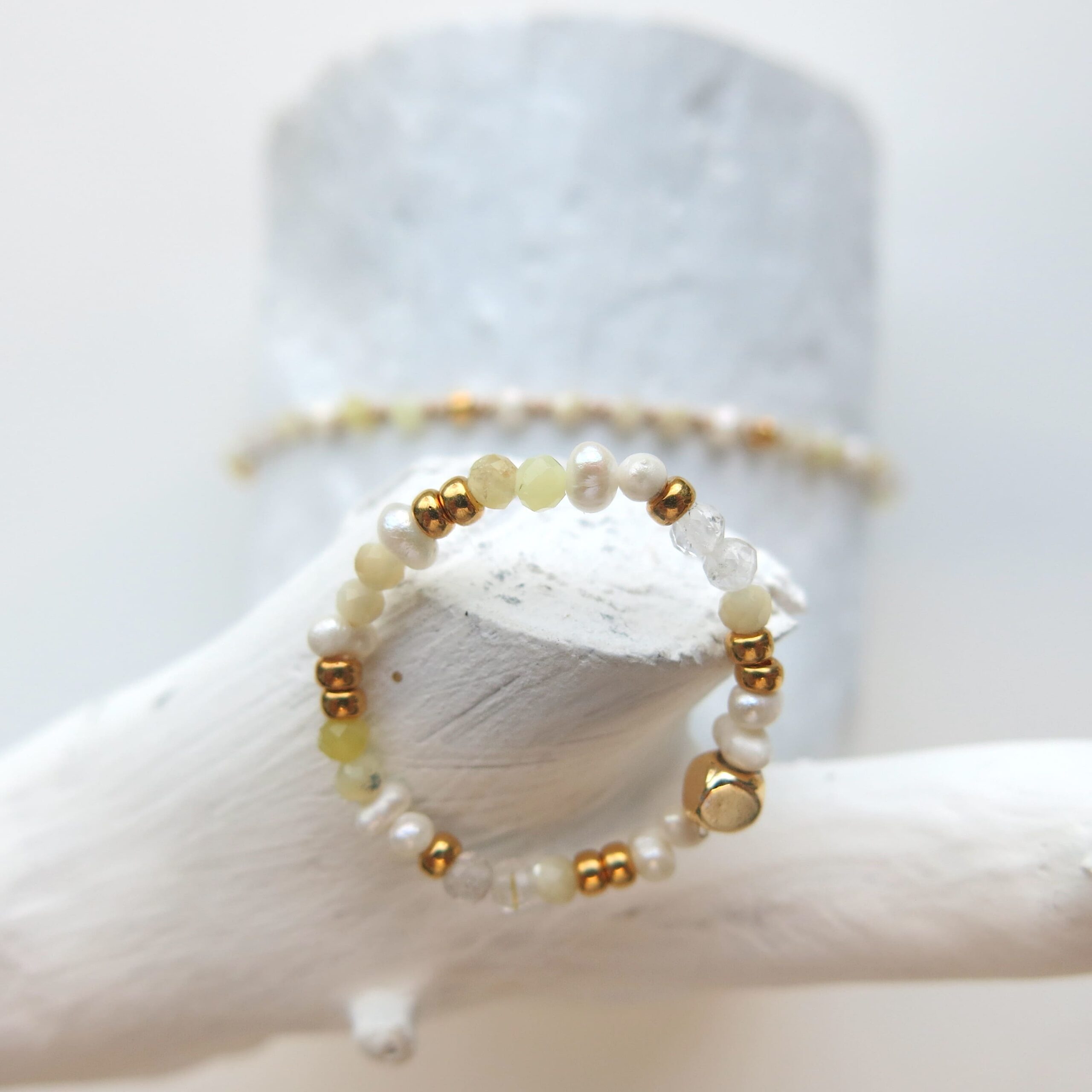 Die Perlen sind auf ein elastisches Band aufgezogen. Somit ist der Ring anpassbar.